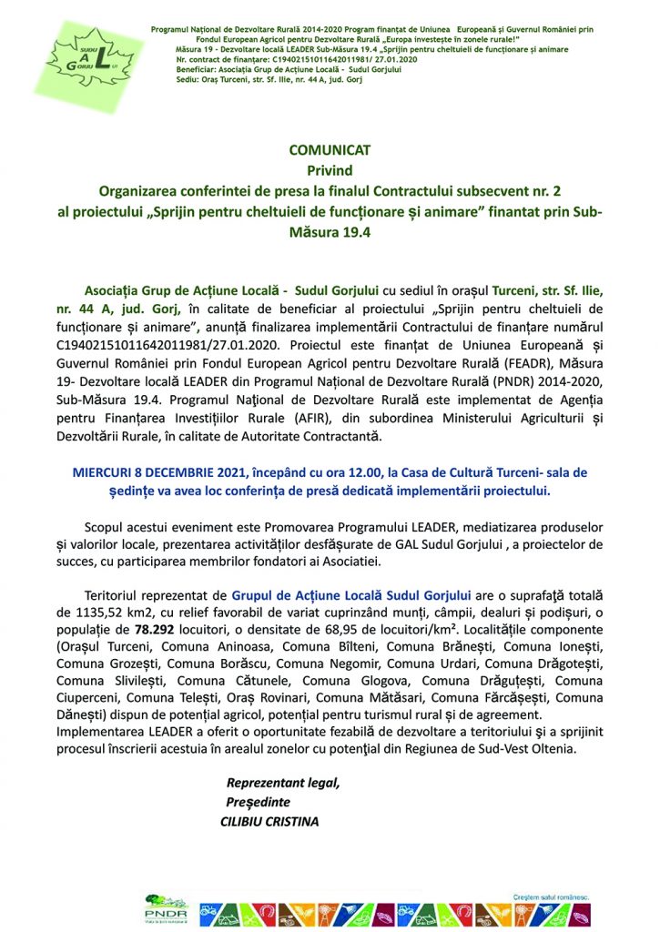EconomieGorjComunicat privind Organizarea conferinței de presă la finalul Contractului subsecvent nr. 2 al proiectului „Sprijin pentru cheltuieli de funcționare și animare” finanțat prin Sub-Măsura 19.4 Jurnalul Olteniei 16 decembrie 2021 Share SHARE Jurnalul Olteniei See Full Bio TAGGED:cheltuielicomunicatconferința contractfunctionaregalproiectsprijinsudul gorjului Distribuie acest articol Facebook Whatsapp Whatsapp Email Copy Link Print Articolul precedent CNSU a actualizat lista țărilor cu risc epidemiologic. Franța și Portugalia, în zona roșie Articolul următor Spitalul Județean de Urgență Târgu-Jiu a primit trei aparate mobile de radiologie Ultima ora Tragedie pe DN 65 lângă Slatina: Un tânăr de 19 ani a murit într-un grav accident 13 decembrie 2025 Salonul Anual de Artă 2025, eveniment major în Mehedinți 13 decembrie 2025 Ștefan Hrușcă vine în premieră la Târgul de Crăciun Craiova 13 decembrie 2025 Tragedie în Gorj: pieton ucis într-un accident violent 13 decembrie 2025 Protest la Craiova pentru justiție și împotriva corupției 12 decembrie 2025 Alertă alimentară: Lapte NAN Nestlé retras urgent din magazine 12 decembrie 2025 Cadouri cool de Crăciun pentru adolescenți 12 decembrie 2025 Satul oltenesc la Craiova. Tradiții de iarnă 12 decembrie 2025 Premieră medicală la Spitalul Craiova: Procedură fără tăieturi pentru o boală rară a esofagului 12 decembrie 2025 Editura Nemira lansează un experiment A.I. care arată cum i-ar putea afecta pe adolescenți noua programă pentru pentru limba și literatura română propusă de Ministerul Educației și Cercetării 12 decembrie 2025