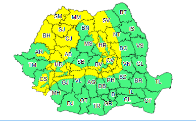 Judeţele vizate de atenţionările Cod galben sunt: Mehedinți, Gorj, Vâlcea, Alba, Argeş, Arad, Bacău, Bihor, Bistriţa-Năsăud, Braşov, Buzău, Cluj, Caraş-Severin, Covasna, Dâmboviţa, Hunedoara, Harghita, Maramureş, Mureş, Neamţ, Prahova, Sibiu, Sălaj, Satu Mare, Suceava, Timiş şi Vrancea.