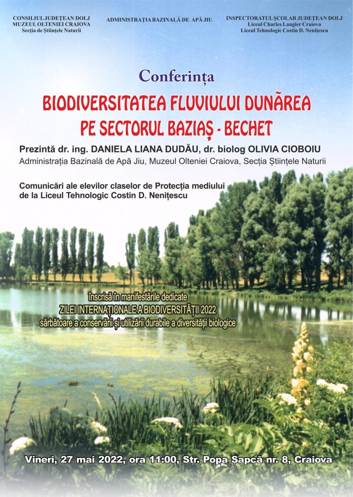 Secţia de Ştiinţele Naturii a Muzeului Olteniei Craiova continuă seria manifestărilor înscrise în cadrul proiectului cultural-educativ Mediul și Universul, cu un program de activități derulate cu ocazia Zilei Internaționale a Biodiversității, respectiv conferința BIODIVERSITATEA FLUVIULUI DUNĂREA PE SECTORUL BAZIAȘ–BECHET, o serie de video proiecții prezentate de dr. ing. Daniela Liana Dudău de la Administrația Bazinală de Apă Jiu și dr. biolog Olivia Cioboiu de la Secția de Științele Naturii a Muzeului Olteniei Craiova, precum și comunicări ale elevilor claselor de Protecția mediului de la Liceul Tehnologic Costin D. Nenițescu.