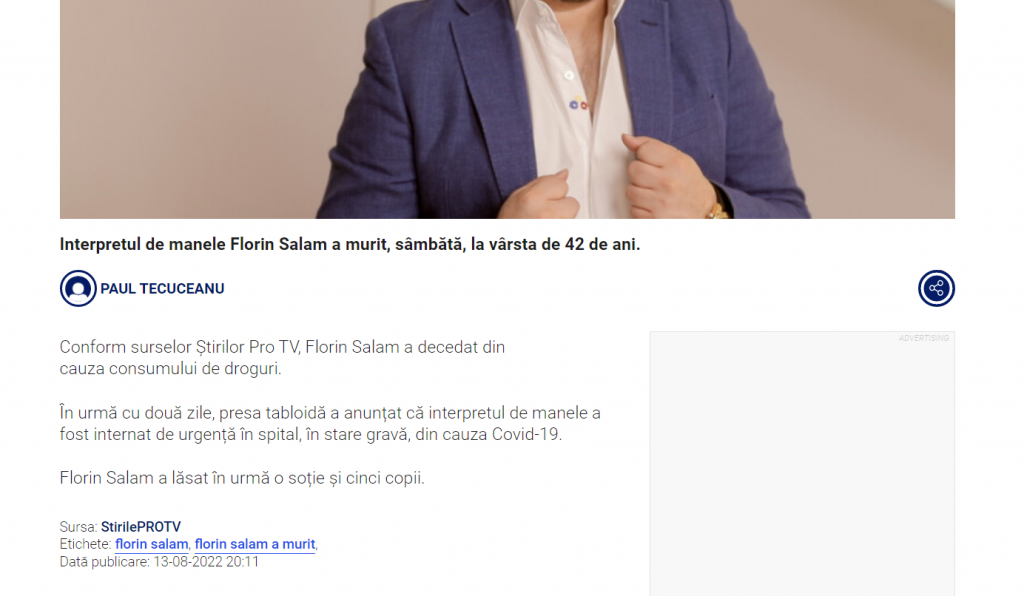 Update: „Dragilor. Voi fi scurt și la obiect. Nu. Nu am murit. Iar din păcate această informație reprezintă o palmă dură asupra credibilității presei din România. Ne vom revedea curand la concerte. Va doresc sănătate tuturor Rușine Pro TV”, este mesajul care a apărut pe pagina de Facebook a manelistului.