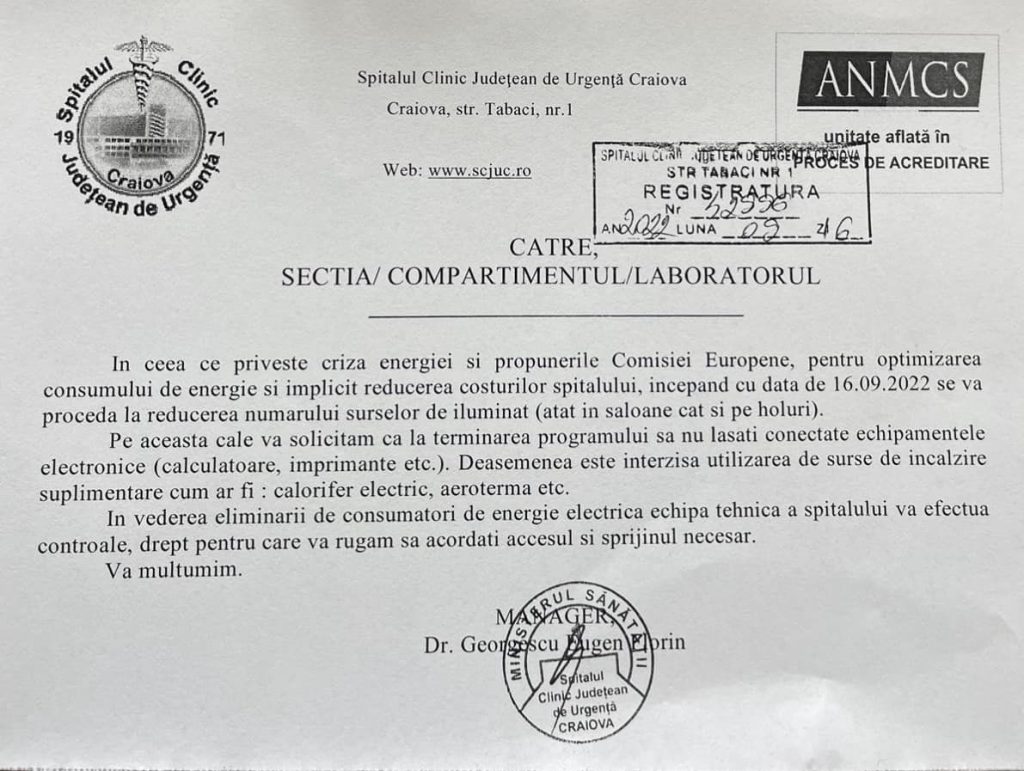 „În ceea ce privește criza energiei și propunerile Comisiei Europene, pentru optimizarea consumului de energie și implicit reducerea costurilor spitalului, începând cu data de 16.09.2022 se va proceda la reducerea numărului surselor de iluminat (atât în saloane cat și pe holuri). Pe aceasta cale va solicitam ca la terminarea programului sa nu lăsați conectate echipamentele electronice (calculatoare, imprimante etc.). De asemenea este interzisa utilizarea de surse de încălzire suplimentare cum ar fi: calorifer electric, aeroterma etc.”, se arată într-o decizie a conducerii spitalului, publicată pe facebook.