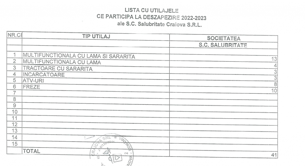 Deoarece S.C. Salubritate Craiova S.R. L. nu dispune în parcul propriu de toate utilajele necesare desfășurării activității de deszăpezire, s-a demarat procedura de închiriere de utilaje specifice de la alți agenți economici prin licitație publică, pentru cele 8 loturi. De asemenea, există un contract până la sfârșitul anului 2022 pentru furnizarea de materiale antiderapante.