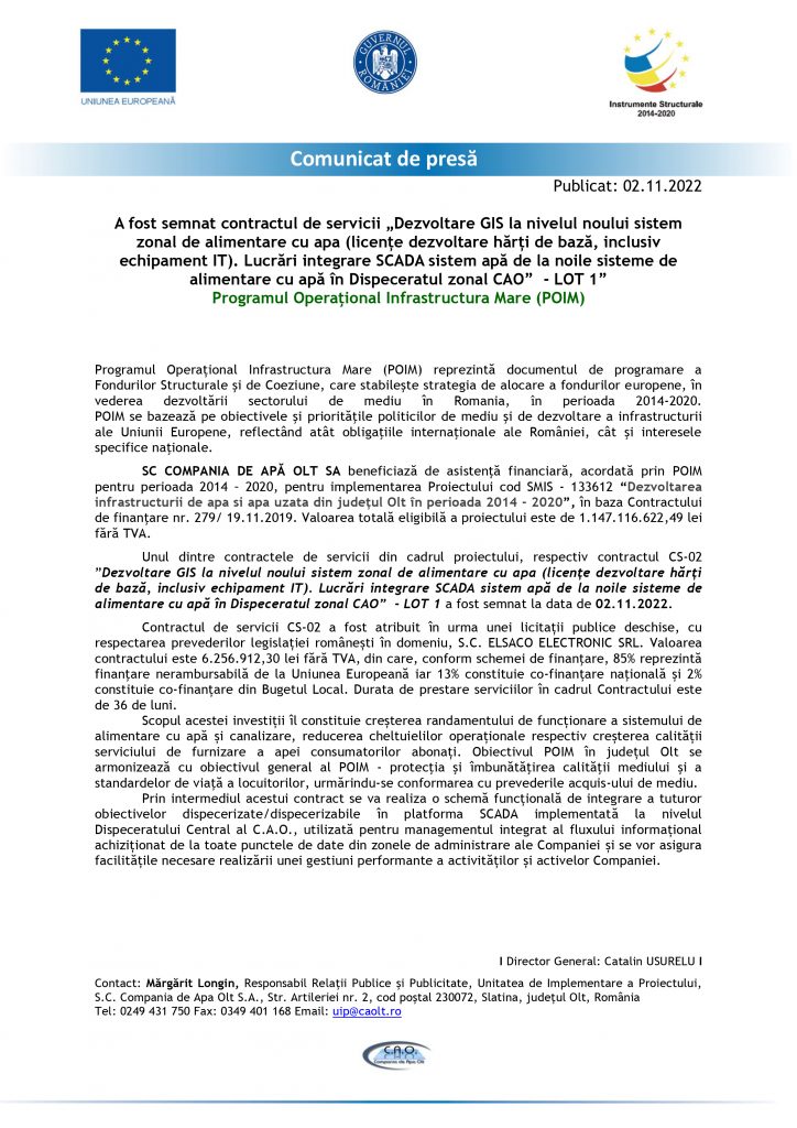A fost semnat contractul de servicii „Dezvoltare GIS la nivelul noului sistem zonal de alimentare cu apă (licențe dezvoltare hărți de bază, inclusiv echipament IT). Lucrări integrare SCADA sistem apă de la noile sisteme de alimentare cu apă în Dispeceratul zonal CAO” – LOT 1. Programul Operațional Infrastructura Mare (POIM)