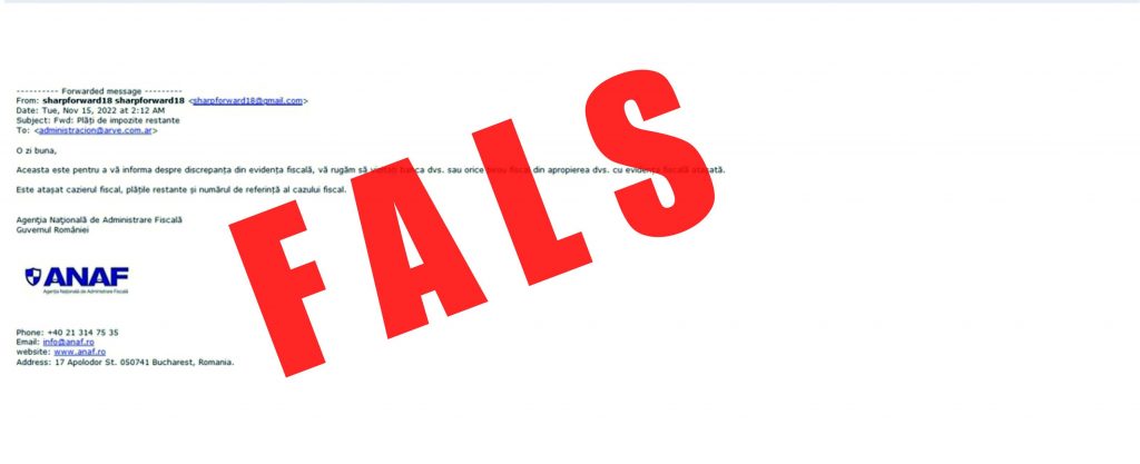 ANAF avertizează că sunt trimise mesaje false pe e-mail, în numele instituţiei şi îi sfătuieşte pe contribuabili să nu le deschidă pe cele marcate cu titlul: „discrepanţe în evidenţa fiscală”.