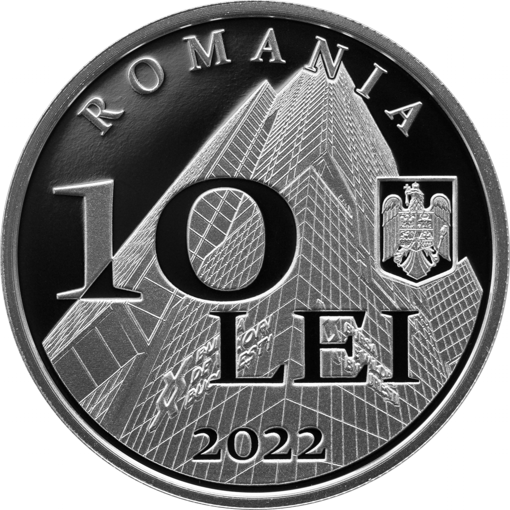 Aversul monedei prezintă sediul actual al Bursei de Valori București, inscripția în arc de cerc „ROMANIA”, valoarea nominală „10 LEI”, stema României și anul de emisiune „2022”.