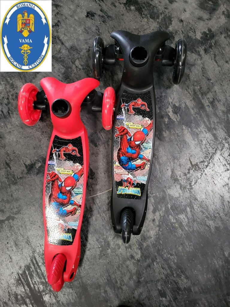 “Ca urmare a controalelor, inspectorii vamali au descoperit în primul container 2.670 trotinete pentru copii, cu însemnele a mărcilor comerciale DISNEY și MARVEL. În cel de-al doilea container, inspectorii vamali au descoperit 730 carduri de memorie și adaptoare cu însemnele mărcii MICRO SD, 150 căști wireless și 50 ceasuri smart cu însemnele mărcii APPLE.