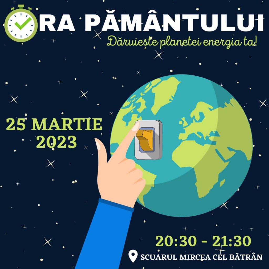 Sâmbătă, 25 martie 2023, între orele 20.30 – 21.30, în Scuarul Mircea cel Bătrân – care, pe parcursul acestei ore, va fi scufundat în întuneric – vor avea loc mai multe manifestări dedicate conştientizării modului în care fiecare dintre noi poate acţiona pentru salvarea Pământului:
