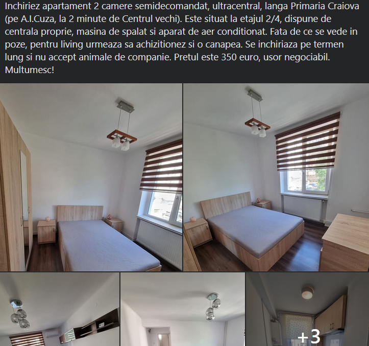 Cum rar se poate găsi o chirie bună sub prețul de 300 de euro pe lună, în Craiova, se poate face o comparație cu ofertele din Capitală. Tot pe platformele online, unde sunt postate anunțuri legate de închirieri, se observă faptul că diferența dintre București și Craiova nu este prea mare, când vinde vorba despre banii plătiți pentru închirierea unei locuințe.