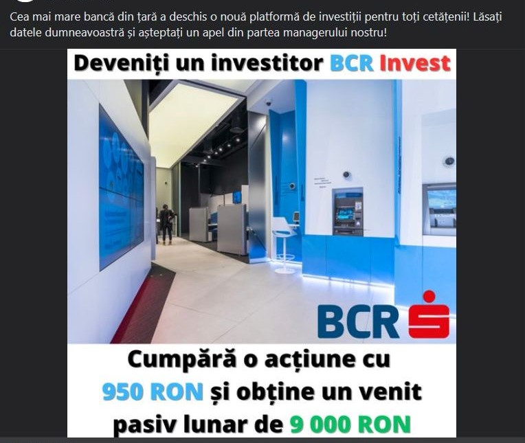 ”La finalul săptămânii trecute, echipa Directoratului publica o avertizare pe social media despre o tentativă de fraudă propagată prin postări sponsorizate pe Facebook, care abuzau de imaginea Banca Transilvania. În ultimele zile, DNSC a identificat «capcane» similare care se folosesc de branding-ul BCR”, a transmis, luni, DNSC, într-o postare pe Facebook.