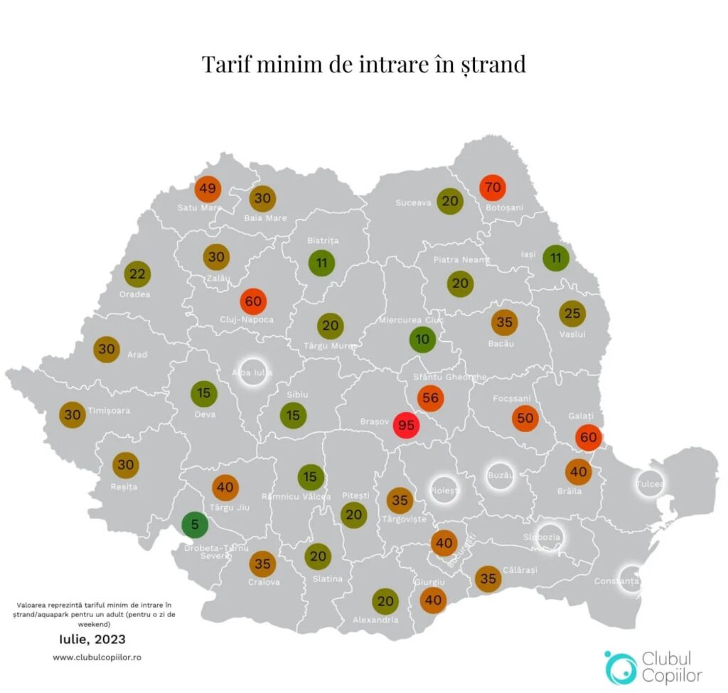 Cu bugetele strâmtorate de creșterea galopantă a prețurilor, o ieșire la ștrand poate fi foarte costisitoare. Cel mai mic tarif de intrare la un ștrand din România este de doar 5 lei pentru adulți în Drobeta-Turnu Severin, urmat de Miercurea-Ciuc (10 lei), Iași (11 lei), Bistrița (11 lei), Sibiu (15 lei), Deva (15 lei) și Râmnicu Vâlcea (15 lei). Slatina se clasează chiar în urma acestor orașe cu un preț de 20 de lei în weekend pentru un adult și 10 lei pentru un copil, potrivit clubulcopiilor.ro.