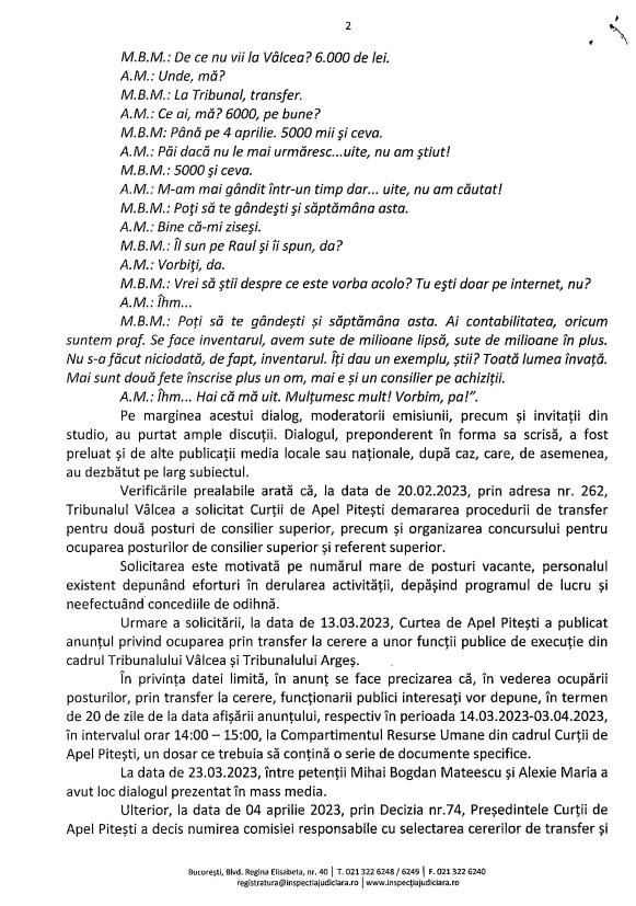 La 48 de ore după emisiunea TV, însuși Bogdan Mateescu a solicitat (primul) Inspecţiei Judiciare să verifice situația. Instituția a constatat: “Verificările prealabile arată că, la data de 20.02.2023, prin adresa nr. 262, Tribunalul Vâlcea a solicitat Curţii de Apel Piteşti demararea procedurii de transfer pentru două posturi de consilier superior, precum şi organizarea concursului pentru ocuparea posturilor de consilier superior şi referent superior. Solicitarea este motivată pe numărul mare de posturi vacante, personalul existent depunând eforturi în derularea activităţii, depăşind programul de lucru şi neefectuând concediile de odihnă.