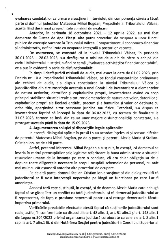 În rezoluţie se precizează că între Bogdan Mateescu şi Stelian Ion există neînţelegeri mai vechi, din perioada în care ambii erau membri în CSM şi că nu există fundament pentru a concluziona că magistratul vâlcean ar fi avut “intervenţii nepermise pe lângă un funcţionar”, aşa cum susţine fostul ministru USR al Justiţiei.