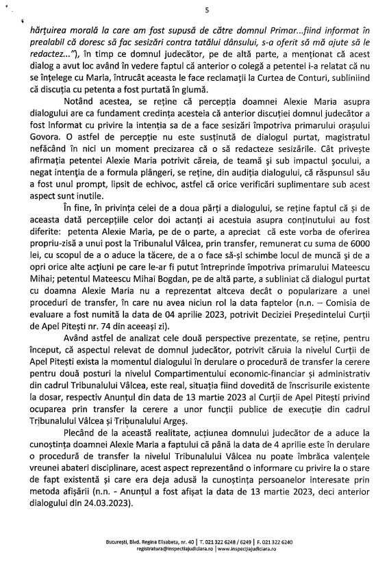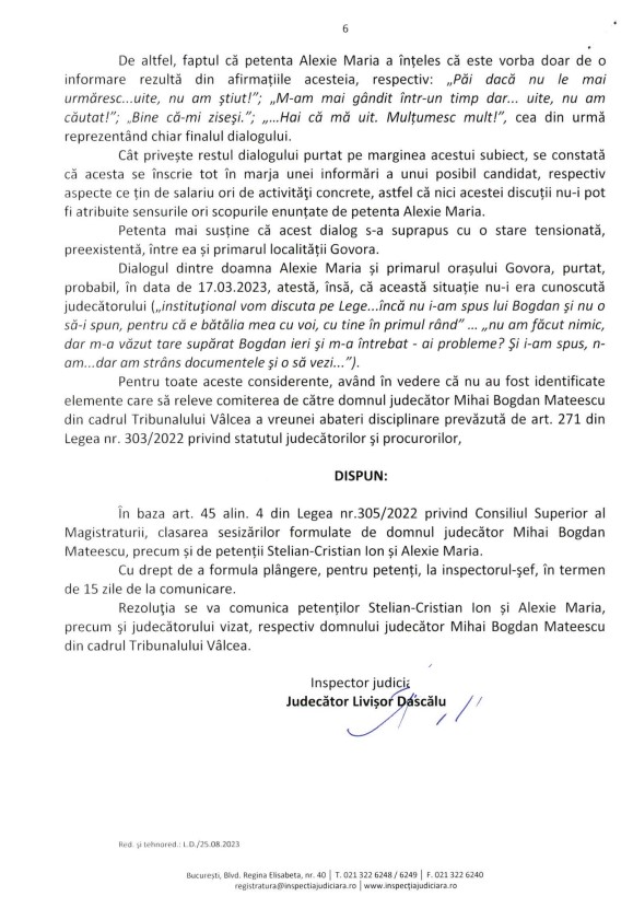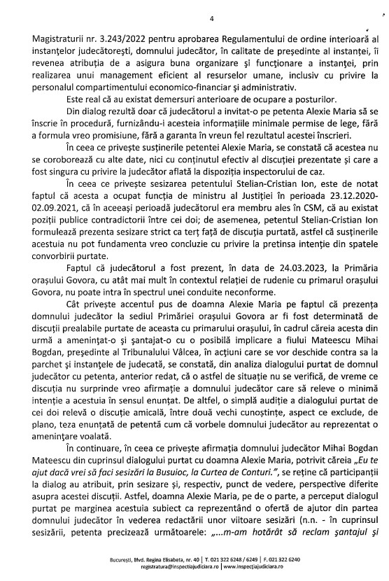 Cât priveşte accentul pus de doamna Alexie Maria pe faptul că prezenţa domnului judecător la sediul Primăriei oraşului Govora ar fi fost determinată de discuţii prealabile purtate de aceasta cu primarului oraşului, în cadrul căreia acesta din urmă a ameninţat-o şi şantajat-o cu o posibilă implicare a fiului Mateescu Mihai Bogdan, preşedinte al Tribunalului Vâlcea, în acţiuni care se vor deschide contra sa la parchet şi instanţele de judecată, se constată, din analiza dialogului purtat de domnul judecător cu petenta, anterior redat, că o astfel de situaţie nu se verifică, de vreme ce discuţia nu surprinde vreo afirmaţie a domnului judecător care să releve o minimă intenţie a acestuia în sensul enunţat. De altfel, o simplă audiţie a dialogului purtat de cei doi relevă o discuţie amicală, între două vechi cunoştinţe, aspect ce exclude, de plano, teza enunţată de petentă cum că vorbele domnului judecător au reprezentat o ameninţare voalată”, se arată în motivarea clasării cazului.
