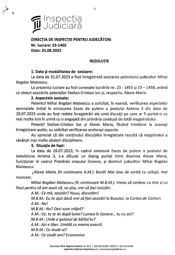 Inspecţia Judiciară a clasat sesizările judecătorului Bogdan Mateescu, fostului ministru USR al Justiţiei, Stelian Ion şi a unei angajate în cadrul Primăriei din Băile Govora. Ultimii doi au reclamat un posibil abuz din partea actualului Președinte al Tribunalului Vâlcea, după apariţia la Antena 3, la sfârșitul lunii iulie, a înregistrării unei discuţii purtate între fostul președinte al CSM și funcționara din primăria condusă de tatăl său, Mihai Mateescu. Din respectivul material difuzat ar fi trebuit să reiasă, potrivit celor care l-au folosit, că magistratul îi oferă funcţionarei reclamante din Băile Govora un post la Tribunalul Vâlcea în schimbul renunţării la demersurile edilului din stațiunea vâlceană. Ce a omis să spună public Maria Alexie a fost faptul că se cunoștea, atât ea, cât și soțul ei, de foarte mulți ani cu judecătorul amintit și că, la data purtării discuției, Bogdan Mateescu nu avea habar că între ea și tatăl magistratului a intervenit o stare de conflict. Dialogul evidențiază o relație de prietenie și nu una de tip negociere și condiționare între cei doi și nici nu lasă loc să se întrevadă oferirea unei garanții pentru ocuparea postului disponibil. Inspectorii de integritate din CSM au precizat că nu au fost constatate elemente care să ateste comiterea vreunei abateri disciplinare din partea actualului Preşedinte al Tribunalului Vâlcea, petenții având drept de plângere la Inspectorul-șef al IJ, judecător Roxana Ioana Petcu, în termen de 15 zile de la comunicare.