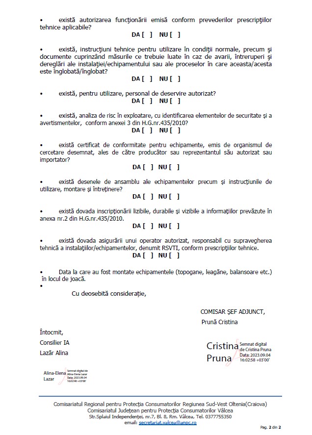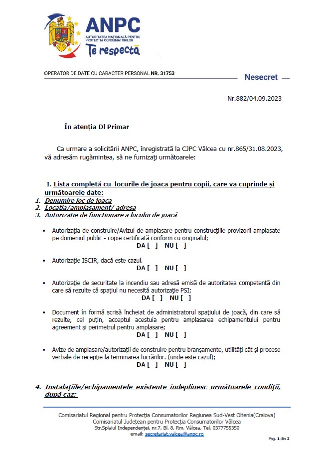Comisariatul Județean pentru Protecția Consumatorilor Vâlcea a transmis luni, 4 septembrie, tuturor primăriilor din județ, cereri de informații amănunțite despre toate locurile de joacă pentru copii existente pe teritoriile ale acestora. Solicitarea vine ca urmare a solicitării Agenției Naționale pentru Protecția Consumatorilor, înregistrată la comisariatul local pe 31 august a.c.