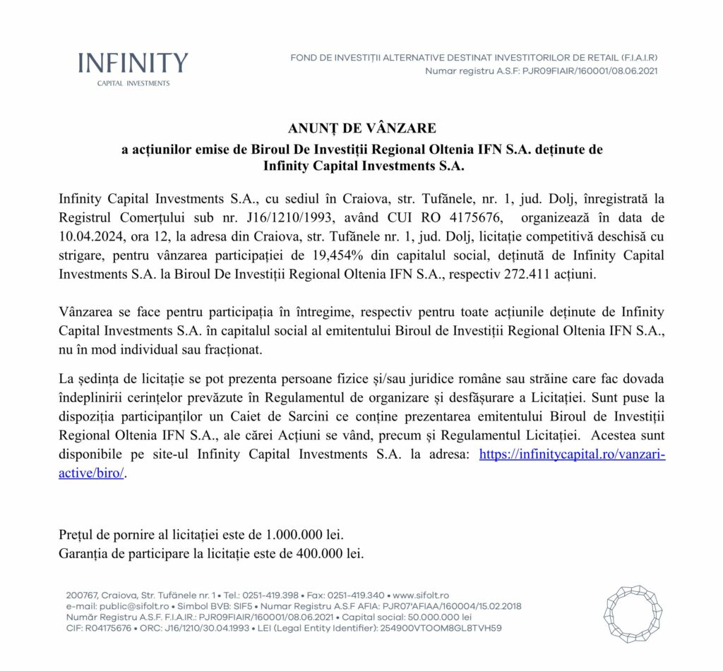 AnunturiANUNȚ DE VÂNZARE a acțiunilor emise de Biroul De Investiții Regional Oltenia IFN S.A. deținute de Infinity Capital Investments S.A. Jurnalul Olteniei 3 aprilie 2024 Share SHARE Jurnalul Olteniei See Full Bio Distribuie acest articol Facebook Whatsapp Whatsapp Email Copy Link Print Articolul precedent Craioveanul Marius Licuț, locul 1 la Campionatul Național de Skandenberg 2024 Articolul următor Bazin de înot la Facultatea de Sport din Craiova, prin PNRR Ultima ora Festivalul Colindului Vâlcean, la final: de la anul, național 14 decembrie 2025 Scandalul alegerilor 2024: Miza nu e Georgescu 14 decembrie 2025 Radiografia șomajului în Mehedinți: vârstnicii, cei mai loviți 14 decembrie 2025 „Zestrea” și Fuego, duminică seara, la Râmnicu Vâlcea 14 decembrie 2025 Incendiu la o locuință din Boișoara 14 decembrie 2025 Final tragic pe DN 55 A: tânăr decedat, o fată rănită 14 decembrie 2025 Conținut, IA și concurență: Google, sub lupa Comisiei Europene 14 decembrie 2025 Românii zboară tot mai mult: Aeroportul din Craiova, pe val 14 decembrie 2025 Raport oficial despre violența domestică și femicide 14 decembrie 2025 Investiție verde în Mehedinți: stop deșeurilor plutitoare 13 decembrie 2025