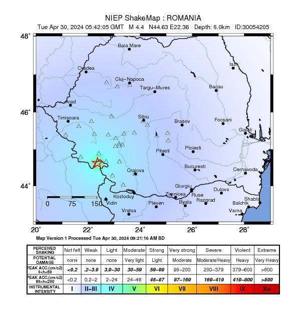 „În ziua de 30 Aprilie 2024, la ora 08:42:05 (ora locală a României), s-a produs în SERBIA, GRANITA CU ROMANIA un cutremur mediu cu magnitudinea ml 4.4, la adâncimea de 6.0 km. Intensitate: V. Cutremurul s-a produs în apropierea următoarelor oraşe: 23km V de Drobeta-Turnu Severin, 81km NV de Vidin, 83km SE de Resita, 86km SV de Targu Jiu”, a transmis Institutul Național de Cercetare-Dezvoltare pentru Fizica Pământului, pe Facebook.