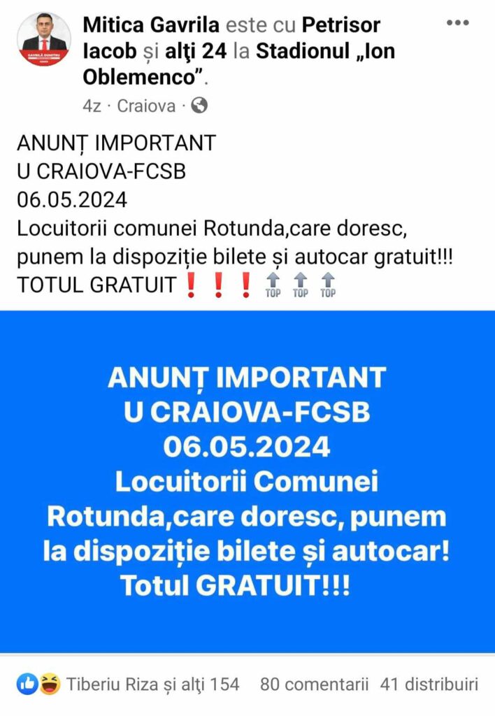 Meciul dintre CSU Craiova și FCSB se apropie. Patrida va avea loc luni, pe stadionul „Ion Oblemenco”, iar oltenii speră să fie susținuți de cât mai multă lume. Totuși, în această perioadă, în mediul online au apărut postări ale unor politicieni, care împart bilete gratuite pentru acest derby.