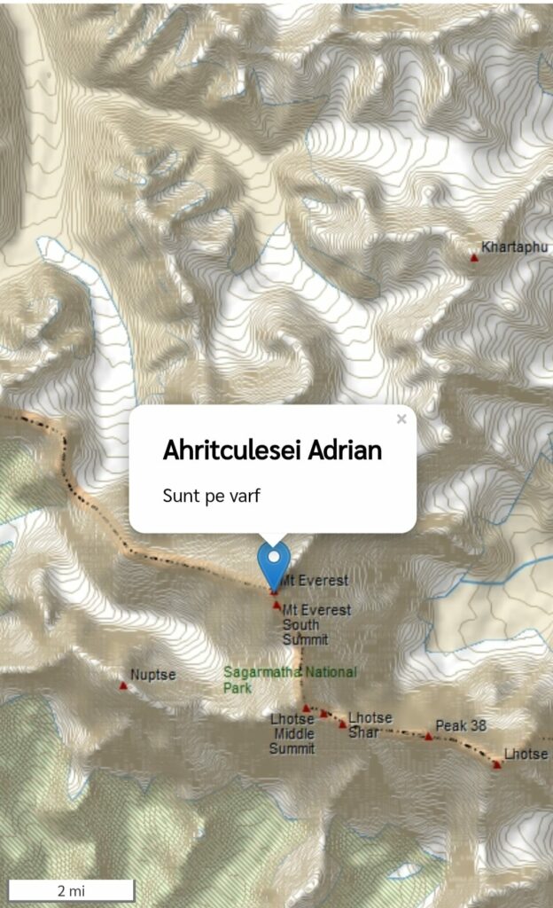 „Ahriţculesei Adrian a cucerit Acoperişul Lumii. Este pe Everest (8.848 m). Urmează partea cea mai grea a acestei expediţii, coborârea spre tabăra de bază, la 5.335 m!”, a notat Jurca pe pagina sa de socializare, unde a postat şi o imagine cu o hartă transmisă de sportiv, în care se poate observa poziţia acestuia.