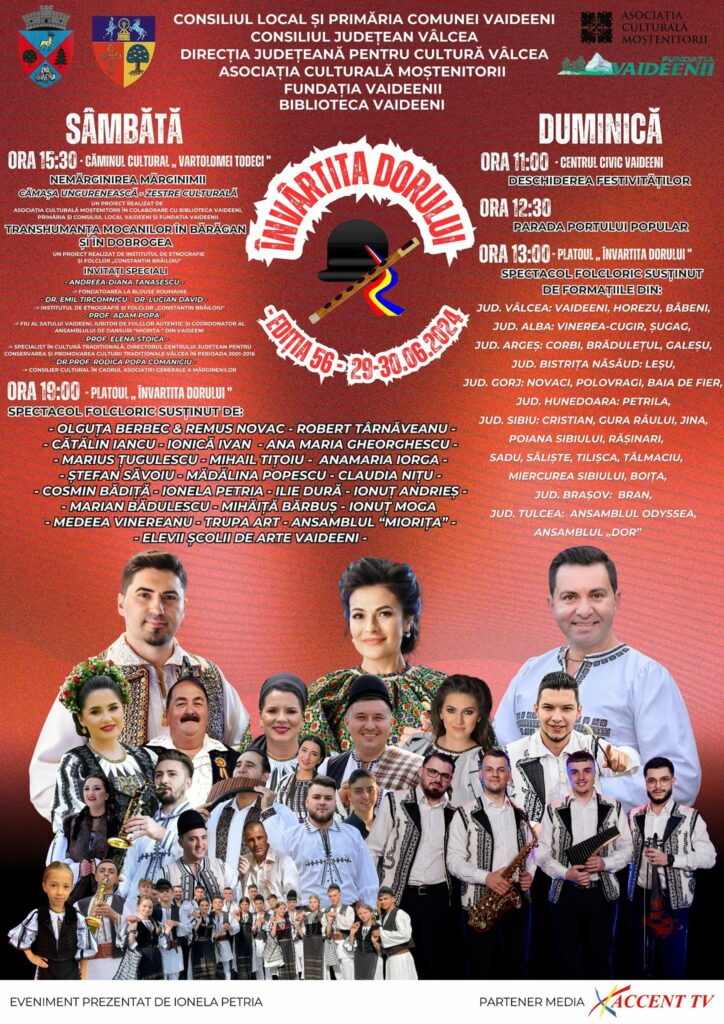 Locuitorii comunei Vaideeni, dar și iubitorii folclorului autentic din toată România se pregătesc de ediția cu numărul 56 a Festivalului Folcloric Păstoresc “Învârtita Dorului”, care va avea loc în perioada 29-30 iunie 2024. Această manifestare este organizată de Primăria Vaideeni, Consiliul Local Vaideeni, Consiliul Județean Vâlcea, Direcția Județeană pentru Cultură Vâlcea, Asociația Culturală Moștenitorii și Fundația Vaideenii și Biblioteca Vaideeni.