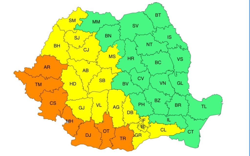 Aceștia atrag atenția și a unui cod portocaliu valabil tot miercuri, 14 august, de temperaturi deosebit de ridicate, caniculă, disconfort termic accentuat. Zone afectate: Banat, sudul Crișanei, sudul și sud-vestul Olteniei, sud-vestul Munteniei.