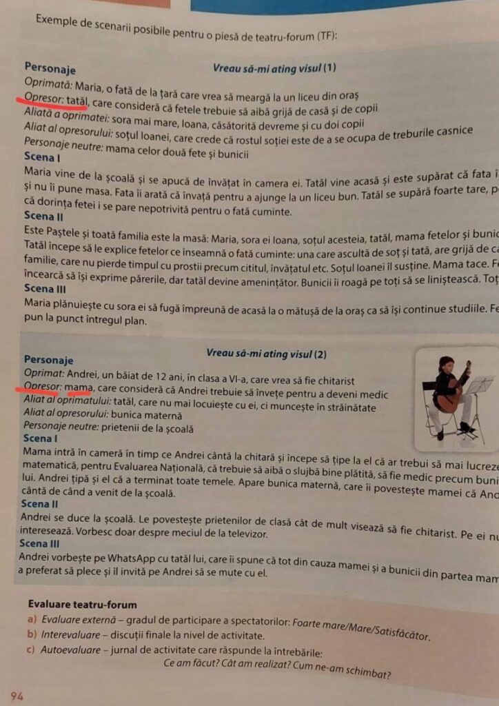 La finalul manualului, copiilor li se propun două scenarii pentru piese de teatru educative. În primul scenariu, o fată pe nume Maria este în rol de „oprimată”, pentru că tatăl ei, „opresor”, nu este de acord să meargă la un liceu din oraș. Deznodământul este acela că Maria și sora ei, deja căsătorită, plănuiesc să fugă împreună de acasă.