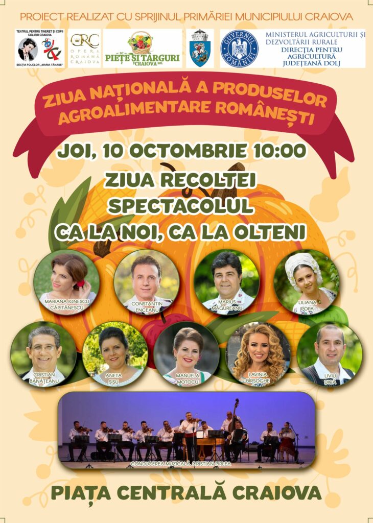 Și, pentru că-i Sărbătoarea Recoltei, tot joi, 10 octombrie, începând cu ora 10.00, Piaţa Centrală din Craiova va găzdui și spectacolul de muzică populară „Ca la noi, ca la olteni”, susţinut de Ansamblul Folcolric „Maria Tănase”.