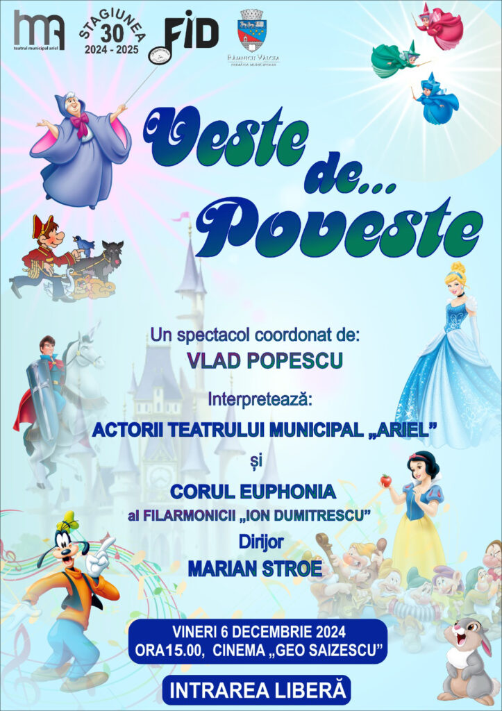 Vineri, 6 decembrie 2024, la Cinema Geo Saizescu, atât la ora 15:00, cât și la ora 17:00, are loc spectacolul „Veste de Poveste”. Atenție: toate locurile pentru spectacolul programat la ora 17:00 au fost deja rezervate.