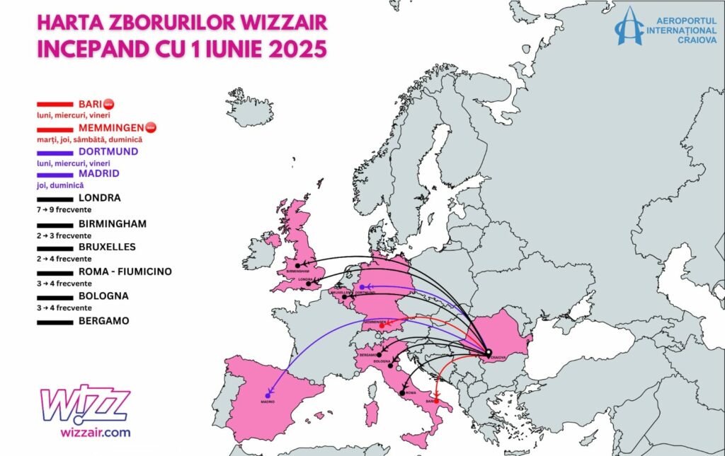 Aeroportul International Craiova anunță că își extinde rețeaua de destinații cu două noi rute internaționale: Memmingen, Germania și Bari, Italia. De asemenea, vor reveni cursele suspendate spre Madrid, Spania și Dortmund, Germania.