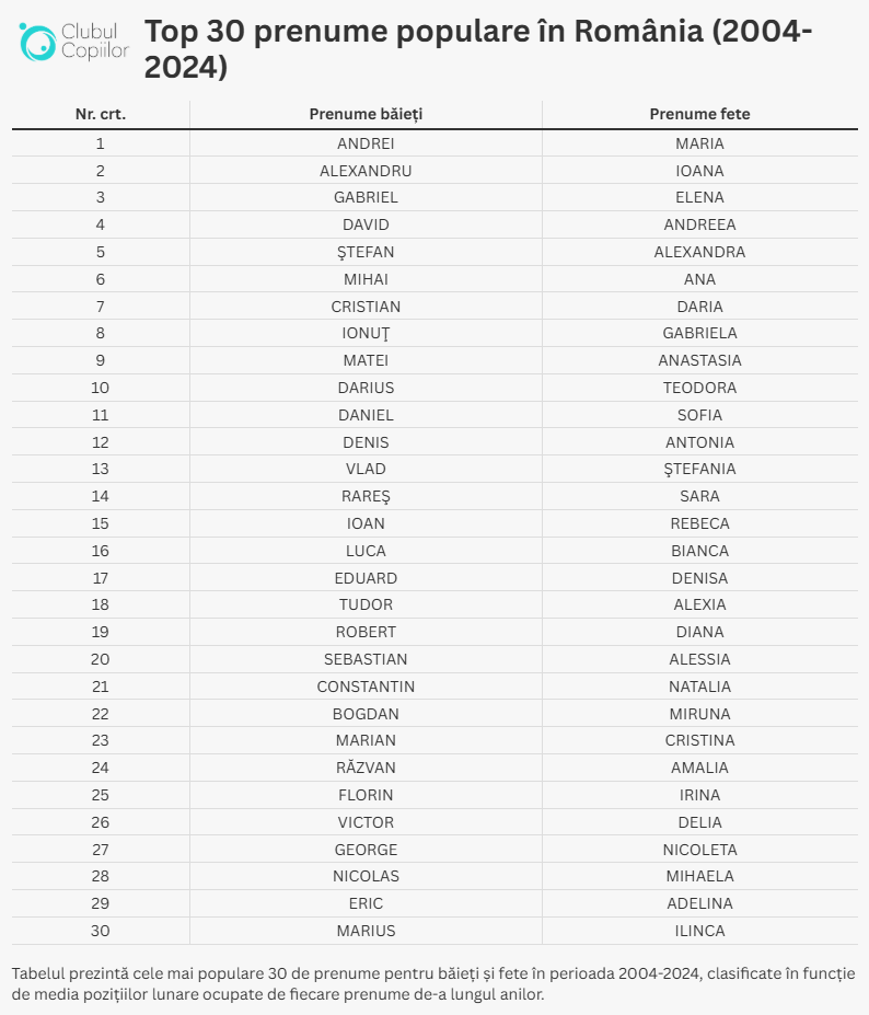 „În ultimii 20 de ani, România a trecut printr-o adevărată revoluție a prenumelor. Nume care păreau de neclintit au fost înlocuite de influențe internaționale, iar nume rare din trecut au revenit surprinzător în topuri. Celebrități, filme, rețele sociale și schimbările culturale au modelat preferințele părinților, iar Clubulcopiilor.ro a analizat fiecare detaliu în cel mai amplu studiu despre evoluția prenumelor românești (2004-2024).