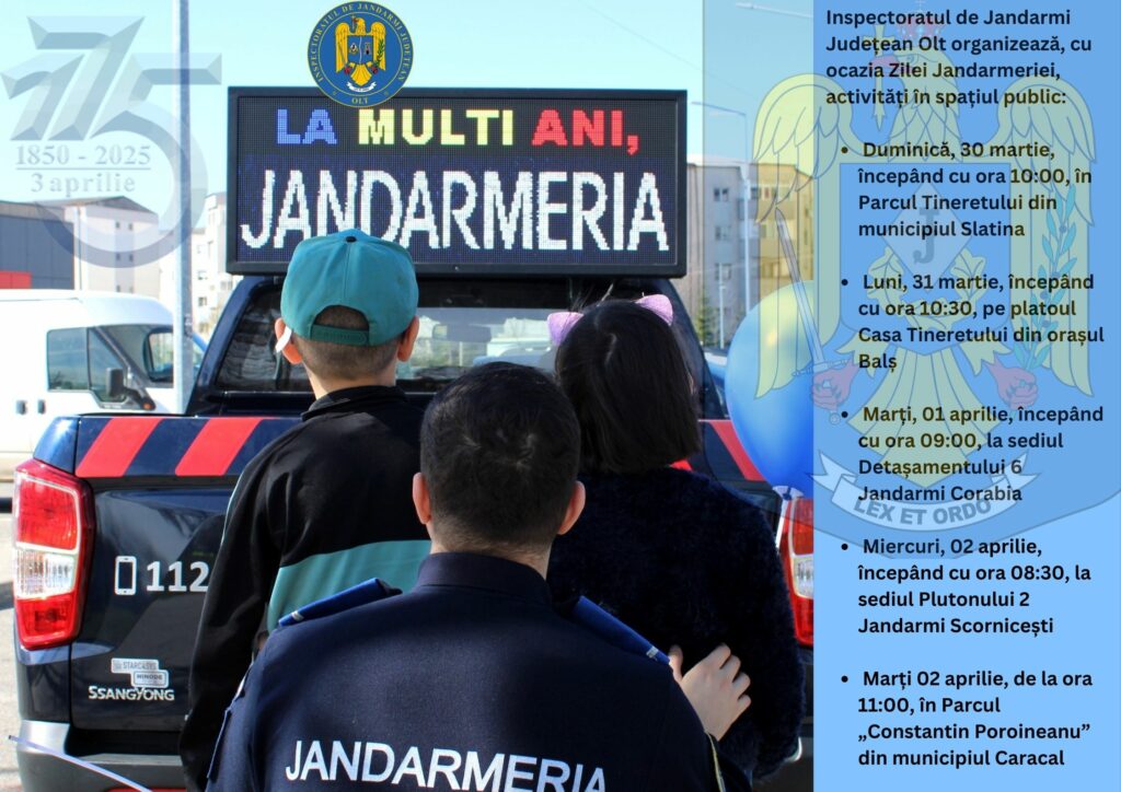 „La data de 3 aprilie 1850, printr-un ofis domnesc, domnitorul Grigore Alexandru Ghica aproba „Legiuirea pentru reformarea Corpului slujitorilor în Jandarmi”, act prin care Jandarmeriei Române îi era conferit statut juridic și erau stabilite principiile de organizare și funcționare. Acest moment marchează începutul existenței instituționale a Jandarmeriei Române, structură cu atribuții esențiale în menținerea ordinii și siguranței publice. Cu prilejul aniversării a 175 de ani de la înființarea Jandarmeriei Române, Inspectoratul de Jandarmi Județean Olt organizează, pe parcursul unei săptămâni, o serie de activități dedicate Zilei Armei. Evenimentele se vor desfășura atât în municipiul Slatina, cât și în localitățile unde unitatea are subunități operative – municipiul Caracal și orașele Corabia și Balș – fiind menite să marcheze simbolic rolul și importanța Jandarmeriei în slujba comunității”, au transmis reprezentanții Jandarmeriei Olt.