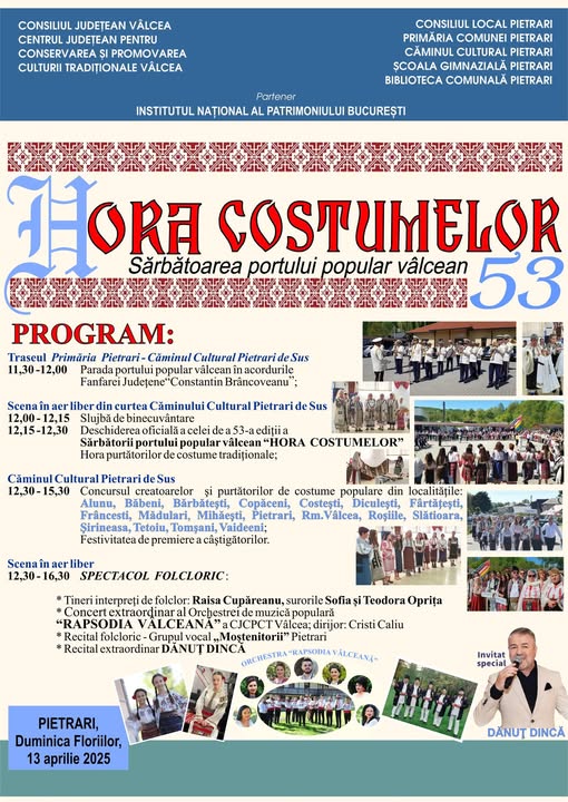 Duminică, 13 aprilie 2025, de Florii, Comuna Pietrari o să fie gaza celei de-a 53-a ediție a unui eveniment deosebit – ‘’Hora Costumelor’’ – Sărbătoarea portului popular vâlcean. Evenimentul este organizat de Consiliul Județean Vâlcea, Centrul Județean pentru Conservarea și Promovarea Culturii Tradiționale Vâlcea și Primăria Pietrari.