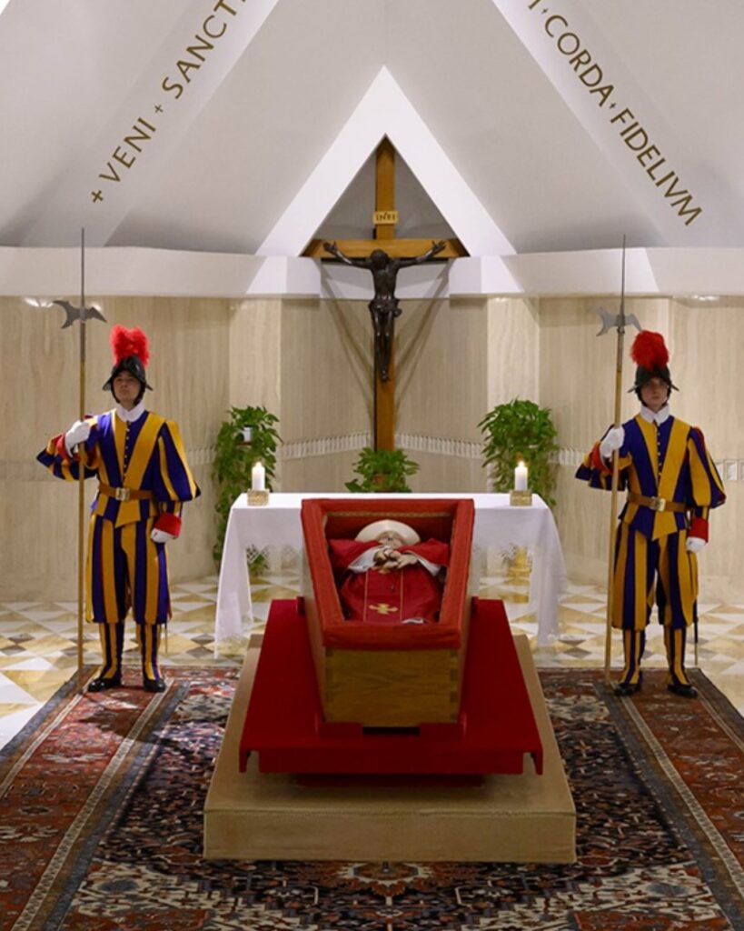 Corpul a fost aşezat într-un singur sicriu din lemn cu interior din zinc şi va fi expus direct în sicriul deschis, dar nu într-un catafalc, aşa cum a fost până acum, şi nici crucea papală nu va fi afişată în timpul acestei expuneri.