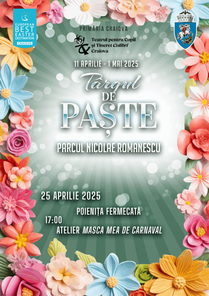 Vineri, 25 aprilie 2025, în Parcul Nicolae Romanescu, la Târgul de Paște, la ora 17:00, în Poienița fermecată se va desfășura atelierul „Masca mea de carnaval“, iar în intervalul orar 17:30 – 18:55, pe main stage, va fi spectacolul „Ca la noi, ca la olteni“, susținut de soliștii: Mariana Ionescu Căpitănescu, Manuela Motocu, Aneta Șișu, Cristian Bănățeanu, Liviu Dică, Luiza Turcu, Alex Golfin, de Orchestra Secției Folclor „Maria Tănase“ (conducerea muzicală Cristian Pîrlea) și de dansatorii Centrului Județean de Cultură și Artă Dolj.