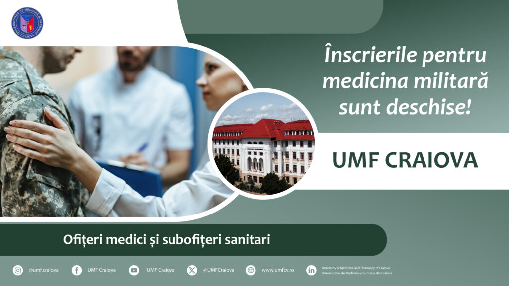 Învățământul militar implică respectarea reglementărilor specifice stabilite de MApN. Dosarele candidaților vor fi verificate de Institutul Medico-Militar, iar rezultatele finale vor fi publicate de ambele instituții. Informații complete despre procedura de înscriere, conținutul programelor și reglementările specifice sunt disponibile pe platforma oficială a Institutului Medico-Militar: https://www.recrutaremapn.ro. ”, mai arată reprezentanții UMF Craiova.