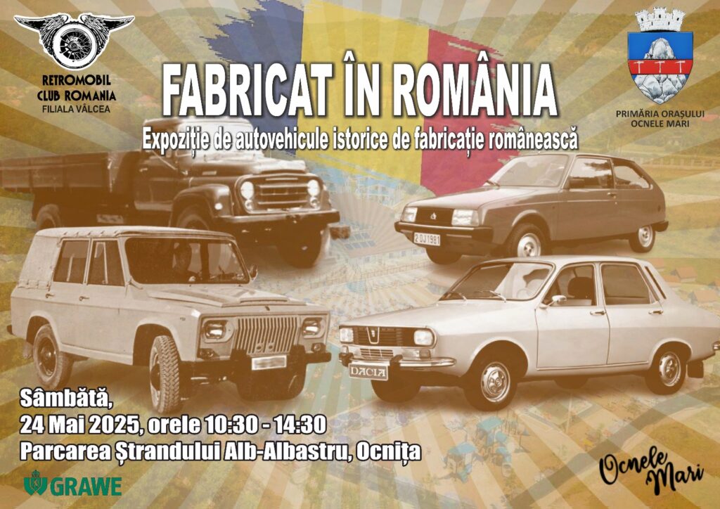 Expoziția se numește „Fabricat în România” și este propusă publicului din orașul Ocnele Mari de Retromobil Club România, filiala Vâlcea, în colaborare cu primăria orașului nostru și cu susținerea Grawe Asigurări România.