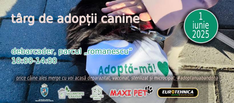De 1 iunie, 7 câini din adăpostul public al Craiovei vor încerca să-și găsească o familie. Târgul de adopții canine, organizat de SC Salubritate Craiova SRL, va avea loc în zona Debarcader din Parcul „Nicolae Romanescu”, între orele 10:00 și 14:00.