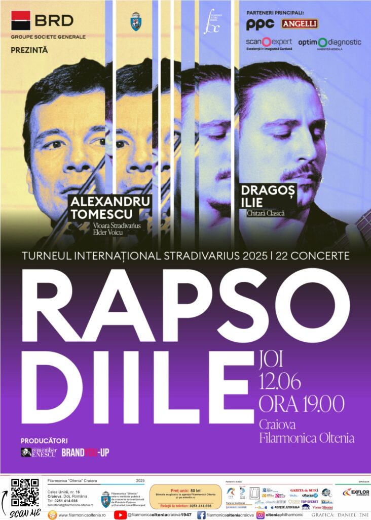 Joi, 12 iunie, ora 19:00, pe scena Filarmonicii revine Turneul Internațional Stradivarius, de data aceasta cu un program alcătuit integral din rapsodii – o formă muzicală liberă, evocatoare, intens colorată. Alexandru Tomescu, care cântă pe vioara Stradivarius „Elder-Voicu”, îl are alături pe tânărul chitarist Dragoș Ilie. În program: cele două rapsodii românești de George Enescu, simboluri ale identității noastre muzicale, și celebra „Rhapsody in Blue” de George Gershwin, una dintre cele mai iubite lucrări simfonice ale secolului XX.