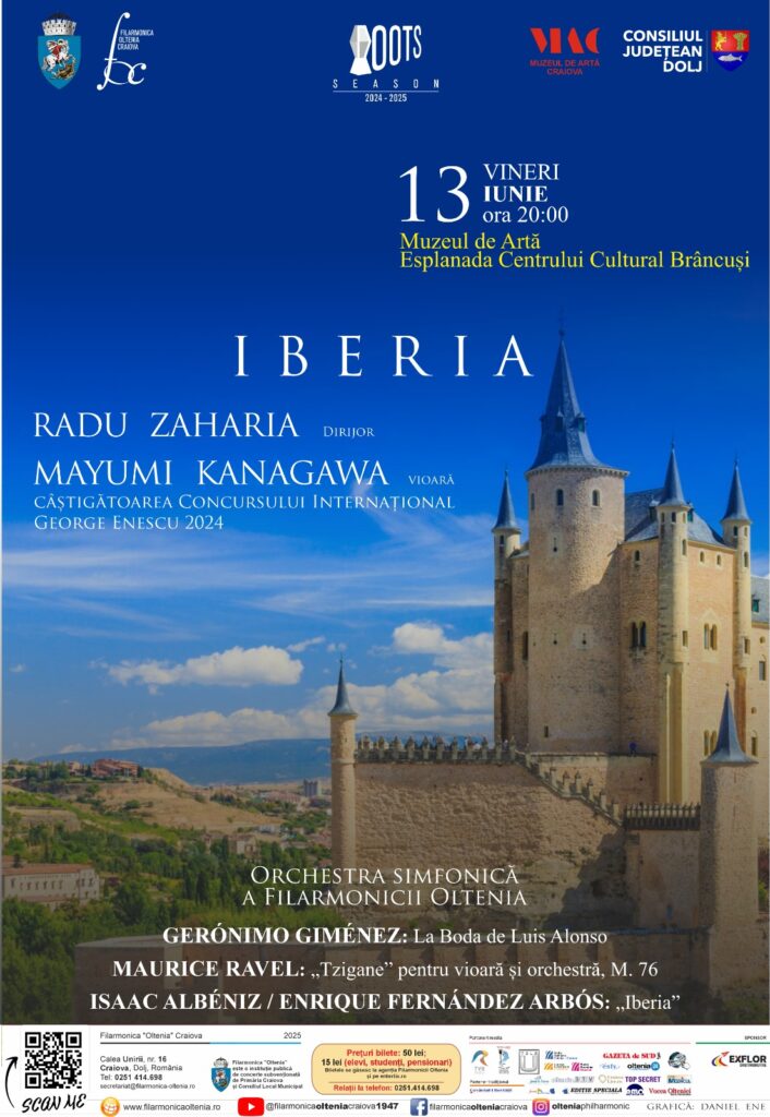 Săptămâna se încheie într-un cadru special: vineri, 13 iunie, ora 20:00, concertul „IBERIA” din seria Seri la Palat, desfășurat în aer liber, pe esplanada Palatului Jean Mihail – Centrul Cultural „Brâncuși”. Orchestra Simfonică a Filarmonicii, condusă de dirijorul Radu Zaharia, o are ca solistă pe violonista Mayumi Kanagawa (Japonia), câștigătoarea Concursului „George Enescu” 2024. Programul, cuprinzând lucrări de Giménez, Ravel și Albéniz, invită publicul într-o călătorie sonoră vibrantă în lumea iberică, unde pasiunea, ritmul și emoția sunt la ele acasă.