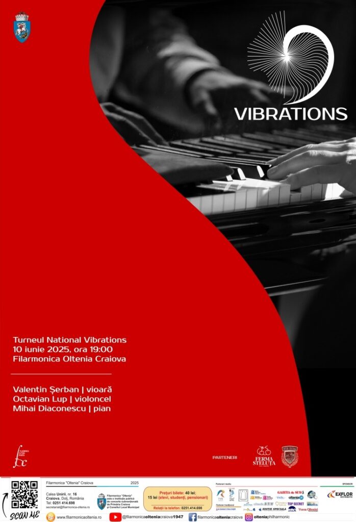 Marți, 10 iunie, ora 19:00, publicul este invitat să descopere turneul național „Vibrations”, care aduce pe scenă trei tineri muzicieni de prestigiu: violonistul Valentin Șerban (laureat al Concursului Internațional „George Enescu”), violoncelistul Octavian Lup și pianistul Mihai Diaconescu. Programul serii propune două lucrări de referință pentru ansamblul cameral de trio cu pian: Trio elegiac nr. 1 în Sol minor de Serghei Rahmaninov, o lucrare timpurie de o mare intensitate lirică, și Trio nr. 1 în Re minor, op. 49 de Felix Mendelssohn-Bartholdy, considerat unul dintre cele mai reușite exemple ale genului din secolul XIX.
