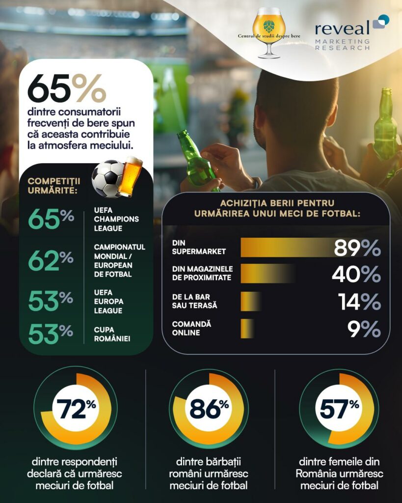 Pentru români, fotbalul nu este doar un sport, ci un prilej de socializare și relaxare, în care berea joacă un rol central. Potrivit unui studiu realizat de Reveal Marketing Research la solicitarea Centrului de Studii despre Bere, 70% dintre români consideră că berea face parte din experiența unui meci de fotbal. Mai mult, 65% dintre consumatorii frecvenți spun că berea contribuie la atmosfera generală a partidei.