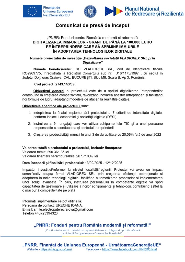 AnunturiOlteniaComunicat de presă de început – „PNRR: Fonduri pentru România modernă și reformată” DIGITALIZAREA IMM-URILOR – GRANT DE PÂNĂ LA 100.000 EURO PE ÎNTREPRINDERE CARE SĂ SPRIJINE IMM-URILE ÎN ADOPTAREA TEHNOLOGIILOR DIGITALE Jurnalul Olteniei 26 iunie 2025 Share SHARE Jurnalul Olteniei See Full Bio Distribuie acest articol Facebook Whatsapp Whatsapp Email Copy Link Print Articolul precedent Rețeaua de irigații din Mehedinți, în modernizare Articolul următor ANRE anunță majorări la tarifele de distribuție a gazelor, de la 1 iulie Ultima ora Insolvența Electrocentrale Craiova: ce se întâmplă cu căldura 14 decembrie 2025 Festivalul Colindului Vâlcean, la final: de la anul, național 14 decembrie 2025 Scandalul alegerilor 2024: Miza nu e Georgescu 14 decembrie 2025 Radiografia șomajului în Mehedinți: vârstnicii, cei mai loviți 14 decembrie 2025 „Zestrea” și Fuego, duminică seara, la Râmnicu Vâlcea 14 decembrie 2025 Incendiu la o locuință din Boișoara 14 decembrie 2025 Final tragic pe DN 55 A: tânăr decedat, o fată rănită 14 decembrie 2025 Conținut, IA și concurență: Google, sub lupa Comisiei Europene 14 decembrie 2025 Românii zboară tot mai mult: Aeroportul din Craiova, pe val 14 decembrie 2025 Raport oficial despre violența domestică și femicide 14 decembrie 2025