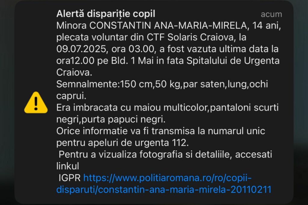 „În dimineața zilei de 9 iulie, ora 03.00, polițiștii Secției 2 Poliție Craiova au fost sesizaţi de către o femeie, din municipiul Craiova, instructor de educație, cu privire la faptul că, în seara zilei de 8 iulie a.c., ora 22.30, CONSTANTIN ANA-MARIA-MIRELA, de 14 ani, a plecat din centrul unde este instituționalizată și nu a mai revenit.