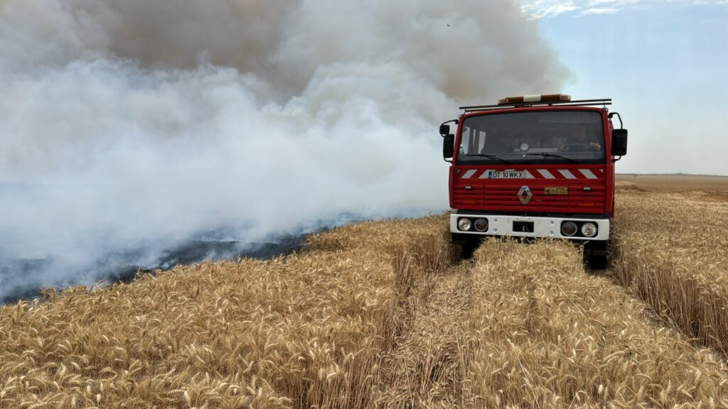 Un incendiu de amploare a izbucnit în comuna Movileni, județul Olt, la un teren agricol, după ce un stâlp de electricitate a fost doborât de vântul puternic și a luat foc.
