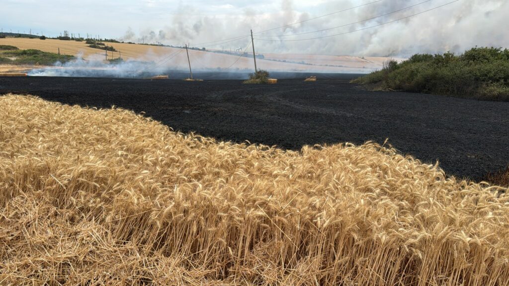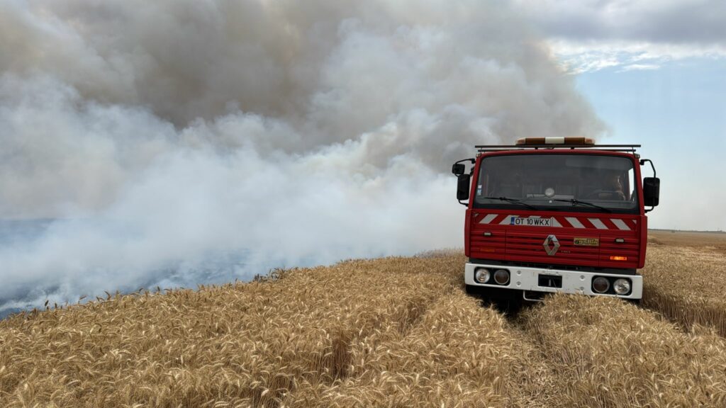 Incendiu în Olt din cauza unui stâlp de electricitate căzut. Zeci de hectare de teren agricol, în pericol (FOTO)