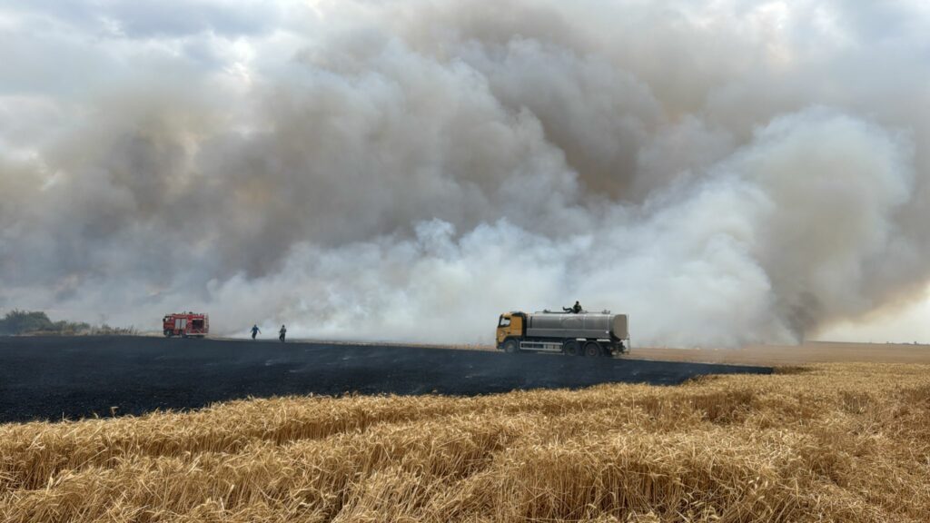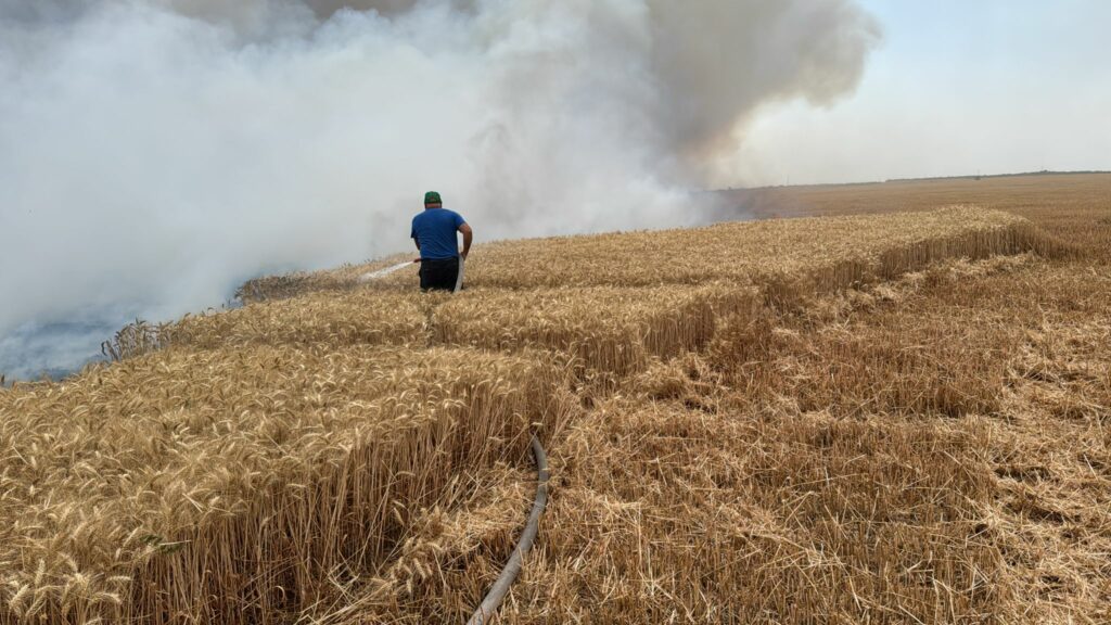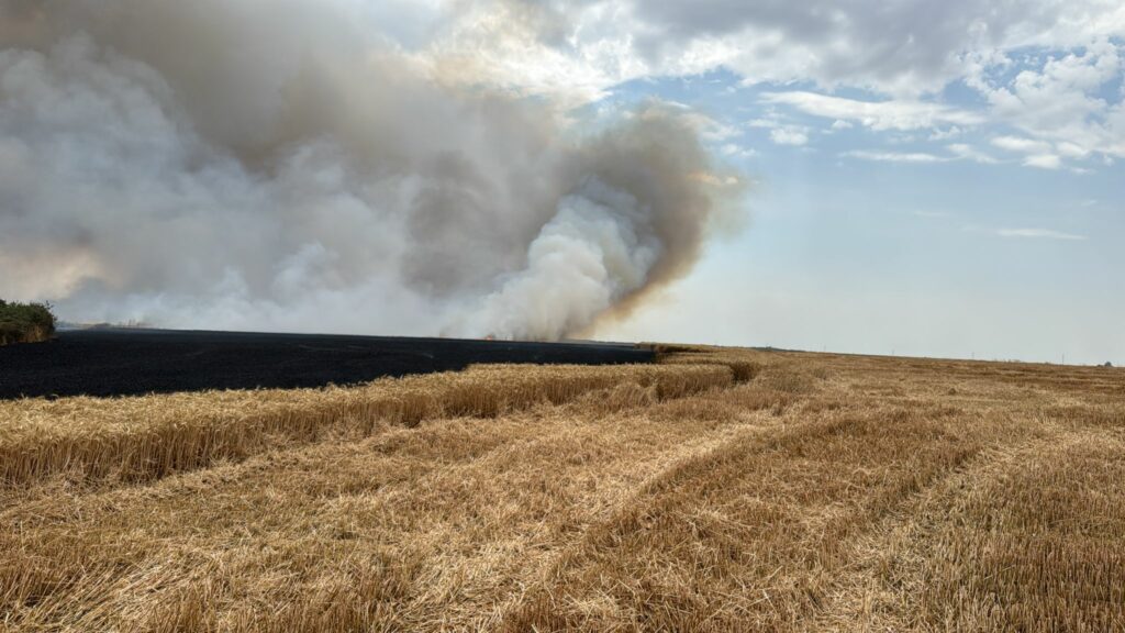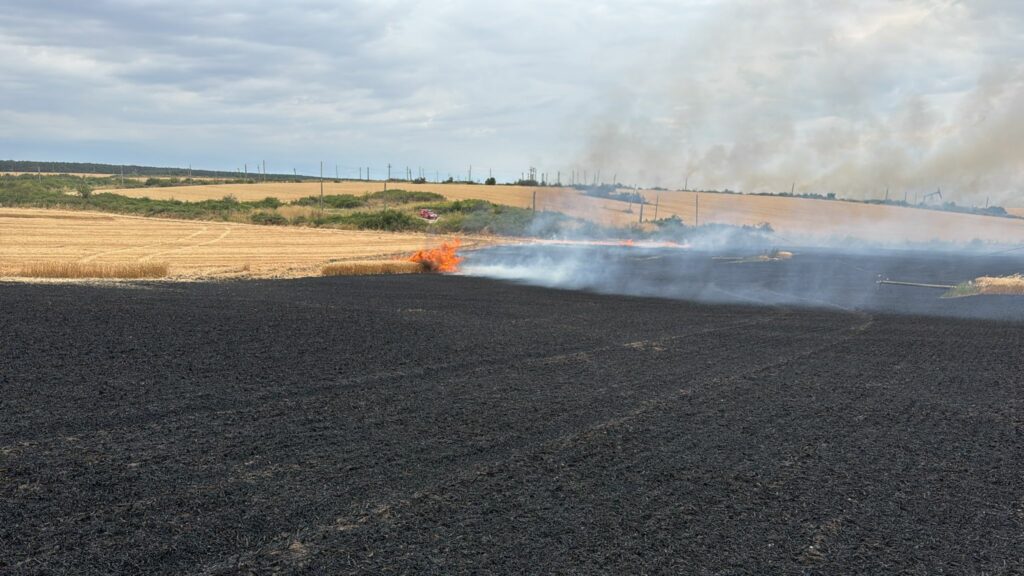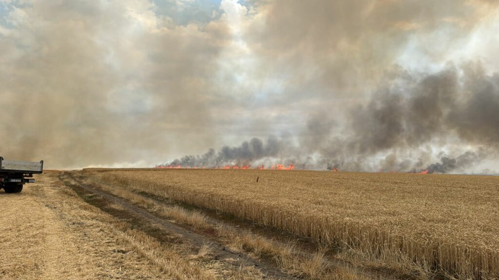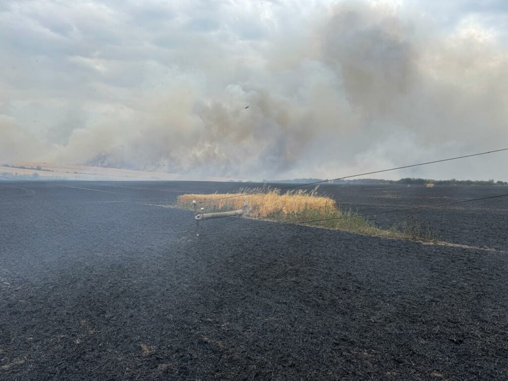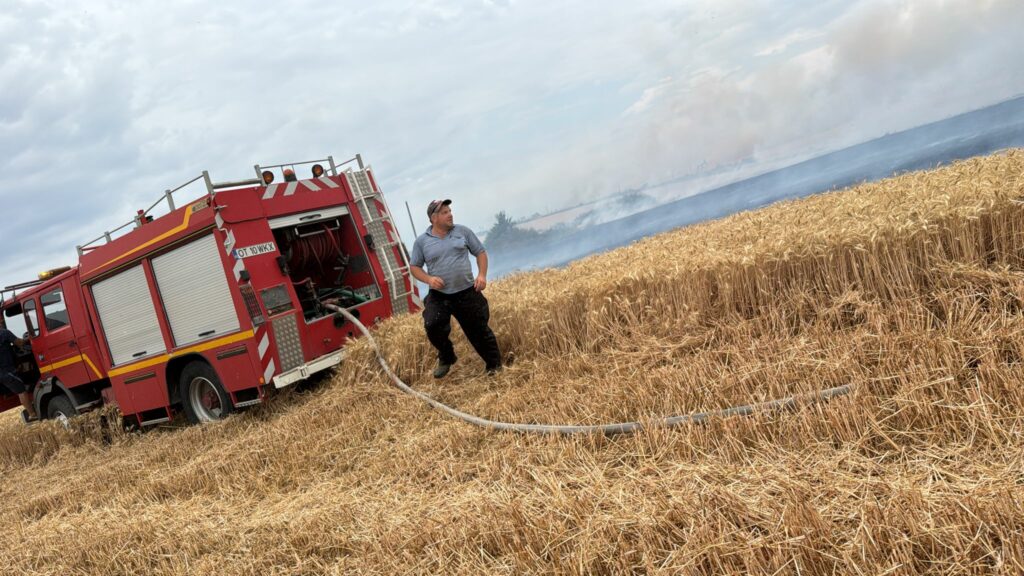 Focul amenință zeci de hectare din zonă, punând în pericol terenurile agricole din apropiere.