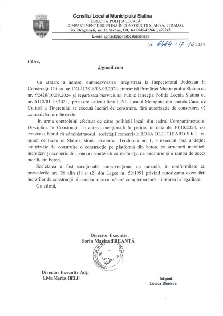 „În urma controlului efectuat de către poliţiştii locali din cadrul Compartimentului Disciplina în Construcţii, la adresa menționată în petiție, în data de 10.10.2024, s-a constatat faptul că administratorul societății comerciale ROSA BLU CHIARO S.R.L. cu punct de lucru în Slatina, strada Ecaterina Teodoroiu nr. 1, a executat fără a deține autorizație de construire o construcţie pe platformă din beton, cu structură metalică, închideri şi acoperiş din panouri sandwich cu destinația de bucătărie și o rampă de acces marfă, din beton.