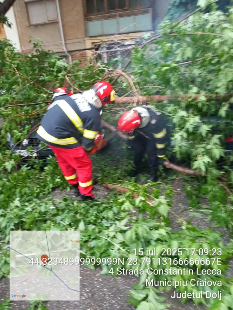 „În urma Avertizărilor meteo de COD PORTOCALIU – averse, grindina, frecvente descărcări electrice, intensificări ale vântului la nivelul județului nu am avut apeluri. In municipiul Craiova Detașamentul de Pompieri Craiova a fost solicitat să intervină cu echipajul de descarcerare pentru degajarea unei crengi căzute pe autoturisme, str. Iancu Jianu. La sosirea forțelor de intervenție, creanga căzută a avariat 3 autoturisme. Aceasta a fost îndepărtată, iar proprietarii pot să-și verifice autoturismele și să vadă pagubele. In acest moment Detașamentul de Pompieri Craiova este solicitat să intervină tot pentru degajarea unei crengi, dar de data aceasta pe B-dul Dacia, Craiova. Aceasta a avariat 2 autoturisme”, au transmis pompierii ISU Dolj.