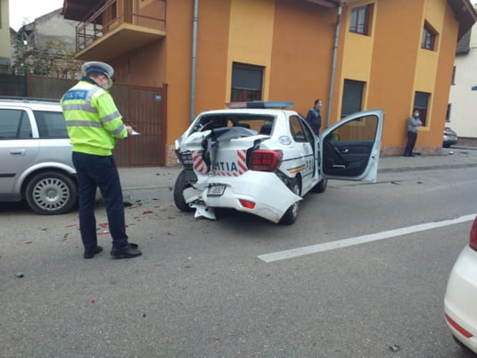 O mașină de poliție a fost spulberată într-o intersecție din Drobeta Turnu-Severin
