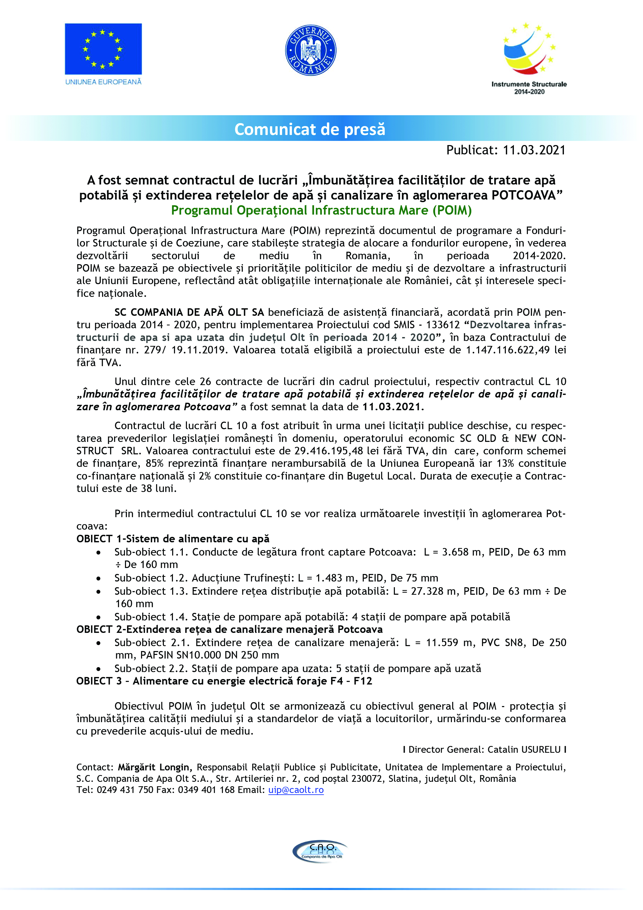 A fost semnat contractul de lucrări „Îmbunătățirea facilităților de tratare apă potabilă și extinderea rețelelor de apă și canalizare în aglomerarea POTCOAVA”. Programul Operațional Infrastructura Mare (POIM)